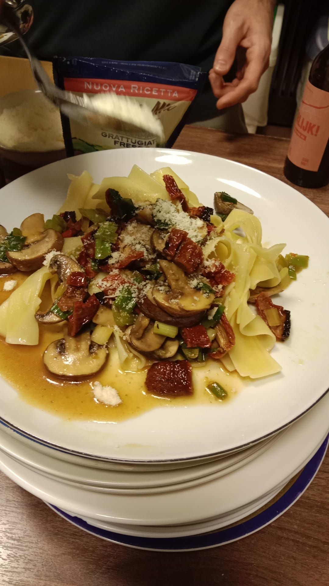 Um weder zu wenig noch zu viel aufzutischen, beschlossen Chris und Ünal, mit ihren zwei separaten Gerichten jeweils 2/3 der angemeldeten Personen zu versorgen um gemeinsam also auf 4/3 der nötigen Menge zu kommen, was rechnerisch zwar aufging, praktisch aber die Möglichkeit eines Nudelnachschlags verhinderte. Chris präsentierte uns Breitbandnudeln mit einer ausgesprochen gelungenen Gemüsesoße mit Pilzen und getrockeneten Tomaten, und Ünal steuerte eine türkische Kartoffelsuppe bei, die unter anderem Mehl, Ei und Dill enthielt und besonders durch ihre zitronige Frische bestach.